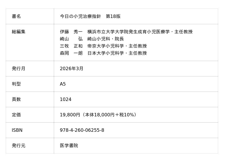 株式会社医学書院 (所在地:東京都文京区 代表取締役社長:金原 俊)は、書籍『今日の小児治療指針 第18版』(総編集:伊藤秀一 / 崎山 弘 / 三牧正和 / 森岡一朗)を2026年4月6日に発売します。