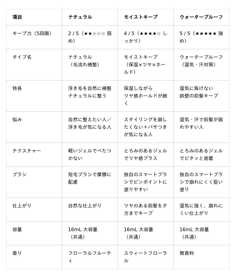 <got2b スタイリングヘアマスカラ 3タイプ比較表>