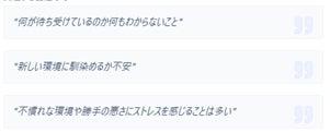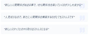 また、具体的なストレス言及では、新生活に伴うストレスの源泉は、対人関係の再構築や未知の環境への適応、業務上のプレッシャーなど多岐にわたります。多くの回答者は、新しいコミュニティでの信頼形成や、不慣れな職場環境への順応プロセスに多大な精神的エネルギーを費やしています。