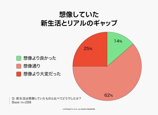 新生活が想像と比べてどうだったかという質問では、「想像通り」(63%)「想像より大変だった」(23%)と、約4人に1人が「想像より大変」と回答しています。