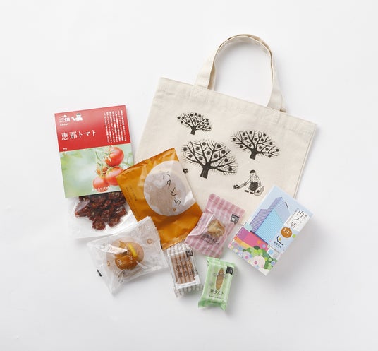 栗拾いのイラストが描かれた「おかしな大地」のトートバッグに、おかしな大地シリーズで人気の「恵那トマト」、「バタどら」を