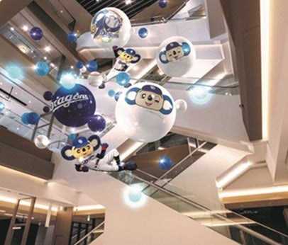 B1Fからの吹き抜け空間にはドアラの多彩な表情やポーズをデザインしたバルーンを展開。鮮やかな「ドラゴンズブルー」を基調とし、ポップにアレンジされたドアラのアート風船が宙に舞い、祝祭の高揚感と遊び心、そして「笑顔」を感じていただける空間です。