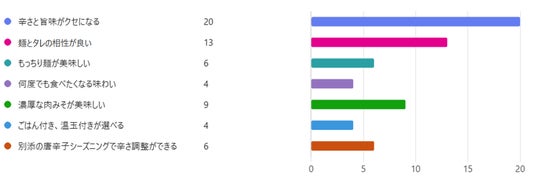 最も多くの票を集めたのは『辛さと旨味がクセになる』というポイントでした。2位は『麺とタレの愛称が良い』、3位は『濃厚な肉みそが美味しい』でした。