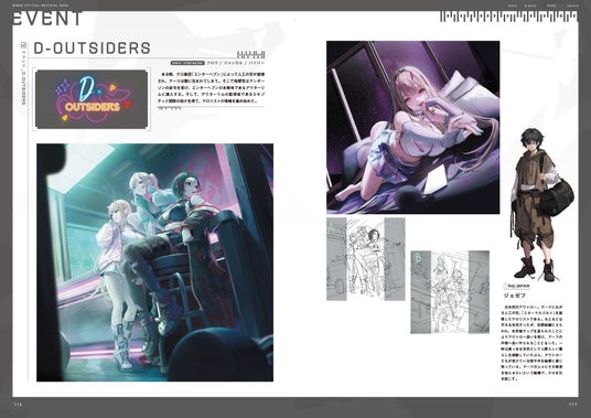 ・各キャラクターの立ちイラストに加え 、制作段階での「初期案」や衣装・武器の設定画なども掲載しています。バーストスキルの絵コンテなど貴重な資料も必見。