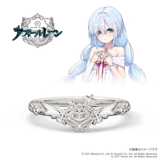 このたびの新作は「アズールレーン」に登場する重桜陣営の軽巡洋艦「能代」、ロイヤル陣営の駆逐艦「ジェーナス」、アイリス陣営の戦艦「アルザス」3名それぞれの衣装の装飾やイメージを表現したリング(指輪)です。