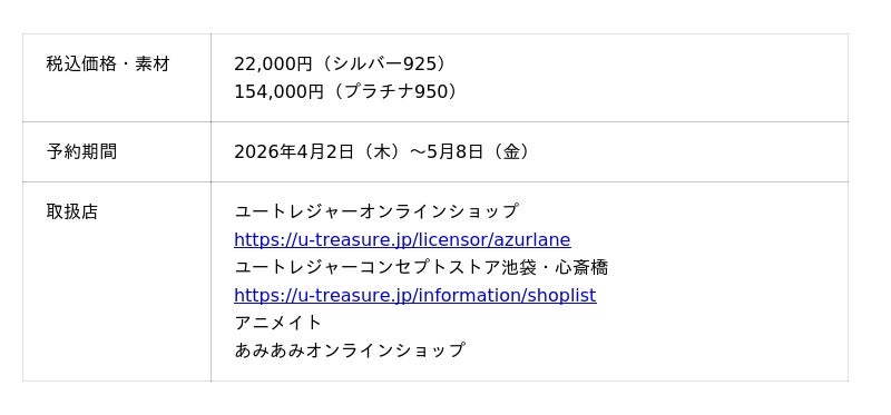 株式会社ユートレジャー(本社:東京都新宿区、代表取締役社長:青木 興一、株式会社ケイ・ウノの連結子会社)は、スマートフォン向けゲームアプリ「アズールレーン」とのコラボレーションアイテム「モチーフリング(指輪)」全3種類(能代、ジェーナス、アルザス)の予約受け付けを、2026年4月2日(木)~5月8日(金)の期間、ユートレジャーオンラインショップ、ユートレジャーコンセプトストア池袋・心斎橋にて行います。