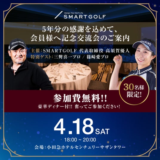 SMART GOLFを長くご利用いただいている会員様を中心に、小田急ホテルセンチュリーサザンタワーにて感謝祭を開催します。三觜喜一プロ、篠崎愛プロをゲストに迎え、ゴルフ談義を交えた交流の場を提供します。