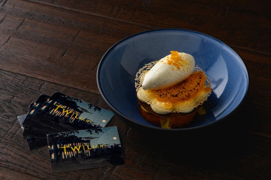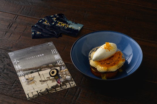 ハーブで香り付けした焦がしバターが乗ったフィナンシェをタルト仕立てにし、コンフィや自家製オイル、パウダーなど、デコポンを多彩な形で重ねました。黄昏の空を思わせる青い器に、新版画が捉えた夜明けや夕暮れの情緒を映し、レゾナンスらしい一皿に仕上げています。