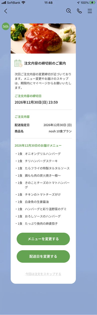 今回のアップデート第一弾として、お客様一人ひとりの配送スケジュールに合わせた「注文変更・スキップ」などの締切通知を開始します。