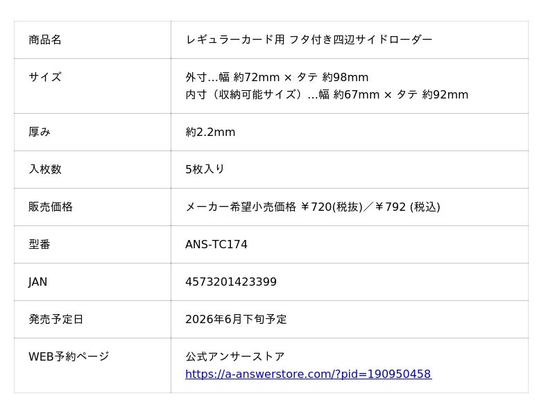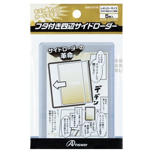 ゲーム周辺機器・トレカサプライメーカーのアンサー株式会社(本社:大阪府大阪市中央区、代表取締役社長:有村 勇志)は、上下左右の四辺を閉じる!公式キャラクタースリーブも収納可能でホイルカードの反りを予防!「レギュラーカード用 フタ付き四辺サイドローダー」を、公式アンサーストア、全国の家電量販店、小売店、専門店、インターネットショップ等にて6月下旬より販売を開始することをお知らせいたします。また、本日より公式アンサーストアにて先行予約を受付開始いたします。