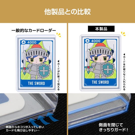 本製品は、上下左右すべてのフレームが閉じる構造を採用したサイドローダーです。スリーブに入れたカードを専用のフタ付き収納トレイに載せて横から差し込むだけで、四辺が均等に閉じた硬質ローダーとして保護できます。