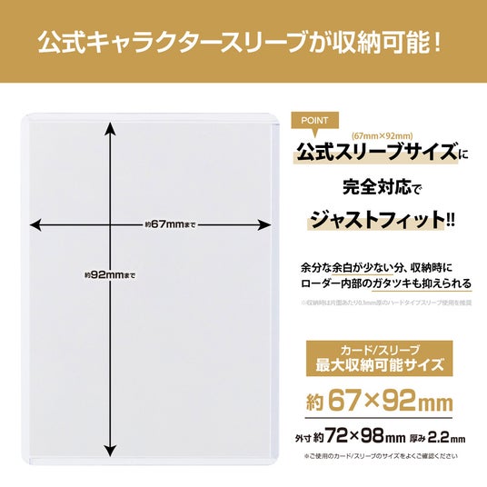 サイドローダー内部に収納できるスリーブは、公式に販売されている公式スリーブのサイズ(67mm×92mm)に完全対応でジャストフィットの設計。余分な余白が少ない分、収納時にローダー内部のガタツキも抑えられます。