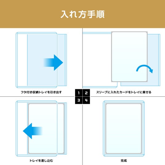 サイドローダーからフタ付き収納トレイを取り出し、スリーブに入れたカードをトレイに載せます。その状態でそっとトレイをローダーに差し込むことで、四辺が閉じられたサイドローダーが完成します。