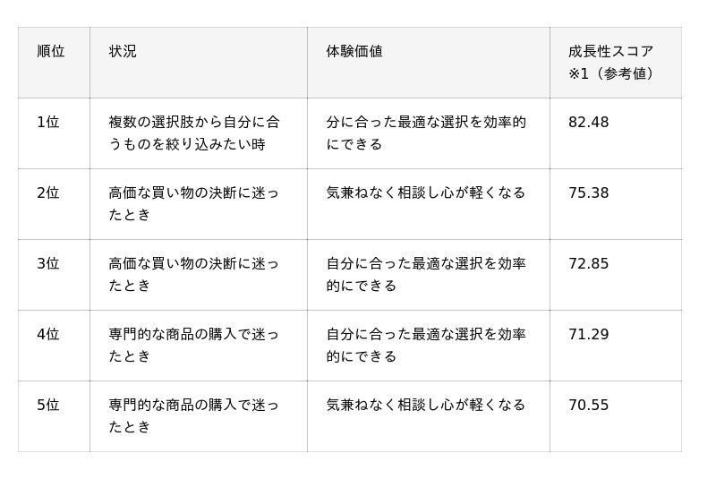 最も高いのは、「複数の選択肢から自分に合うものを絞り込みたい」という状況で「自分に合った最適な選択を効率的にできる」と感じるケースで1位。2位・3位は「高価な買い物の決断に迷ったとき」に「気兼ねなく相談し心が軽くなる」「効率的に選択できる」と感じるケースが占め、4位・5位には「専門的な商品の購入で迷ったとき」の活用がランクインしました。