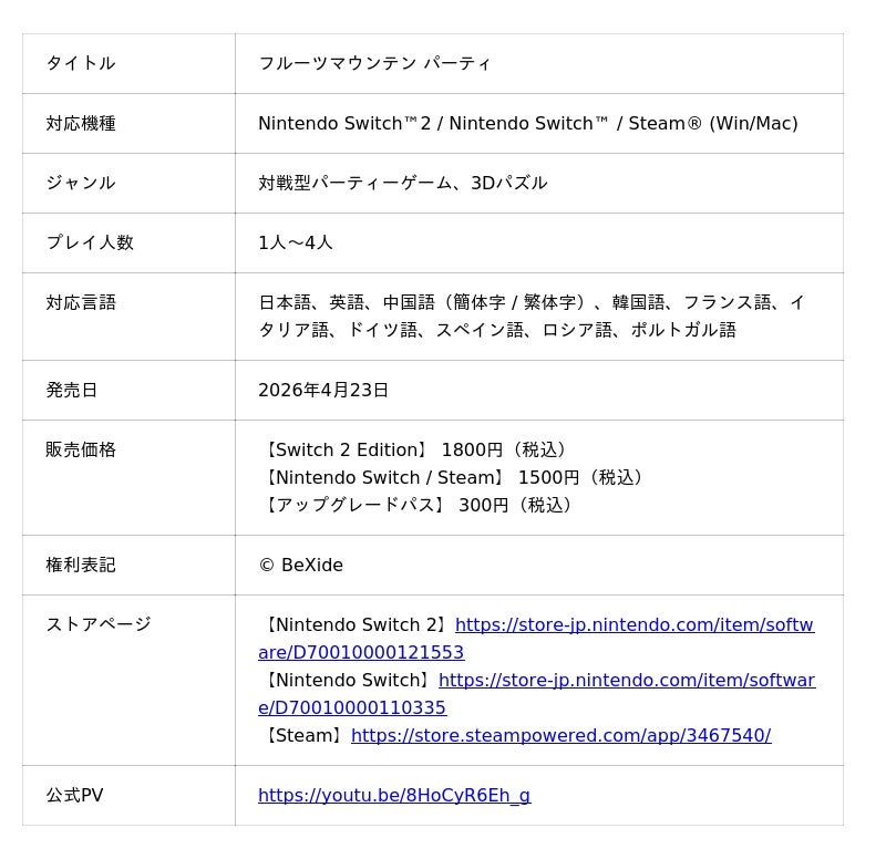 株式会社ビサイド(本社:東京都立川市、代表取締役:南治 一徳)は、現在、Steamにて早期アクセス中の対戦型3Dパズルゲーム『フルーツマウンテン パーティ』につきまして、2026年4月23日(木)にニンテンドーeショップにてNintendo Switch(TM)およびNintendo Switch(TM)2向けに発売することを決定いたしました。