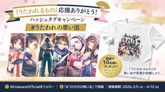 『うたわれるもの』公式X(旧Twitter)では、『うたわれるもの 白への道標』発売記念として、2026年3月5日(木)より「うたわれるもの」シリーズの思い出を投稿していただくハッシュタグキャンペーンを開催いたします。ハッシュタグ「#うたわれの思い出」をつけて、「うたわれるもの」シリーズの思い出や写真などを投稿していただいた方の中から、「うたわれるもの」応援ありがとう!オリジナルTシャツを合計10名の方にプレゼントいたします。