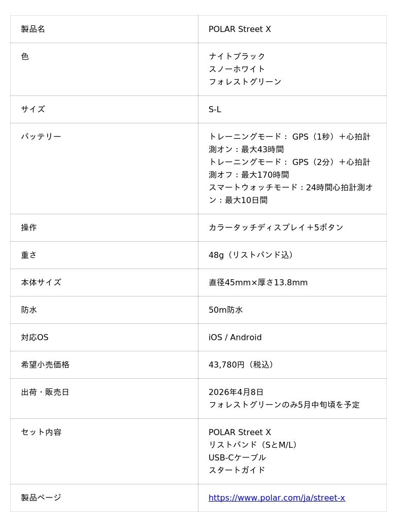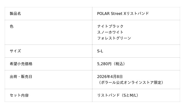 Street Xは2026年4月8日(水)よりオンラインを含む全国のポラール製品正規取扱店にて発売します。ポラール公式オンラインストアでは、本日より予約販売を開始します。希望小売価格は43,780円(税込)で、カラーはナイトブラック、スノーホワイト、フォレストグリーンの3色展開、SとM/Lの2サイズのリストバンドが同梱されています。