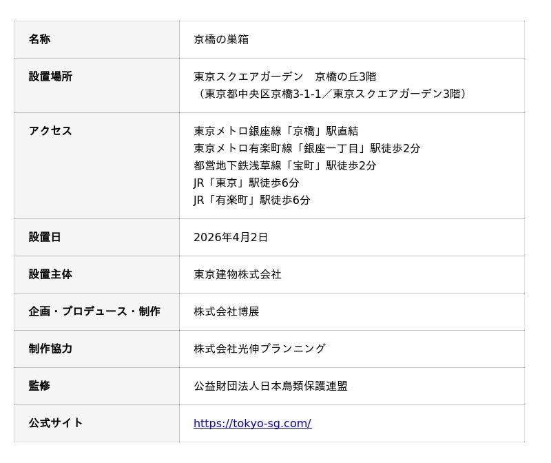 東京建物株式会社および株式会社博展は、東京建物等が保有および管理する複合ビル「東京スクエアガーデン」(東京都中央区)の立体緑化空間「京橋の丘」において、剪定枝や枯葉、建物由来の廃材などを再生利用した巣箱「京橋の巣箱」を2026年4月2日より設置しましたのでお知らせします。「京橋の巣箱」設置プロジェクト(以下「本プロジェクト」)により野鳥の営巣を支援し、巣内の様子をリアルタイムで観察できるライブビューイング機能を備えることで、都市における自然との共生体験を提供します。
