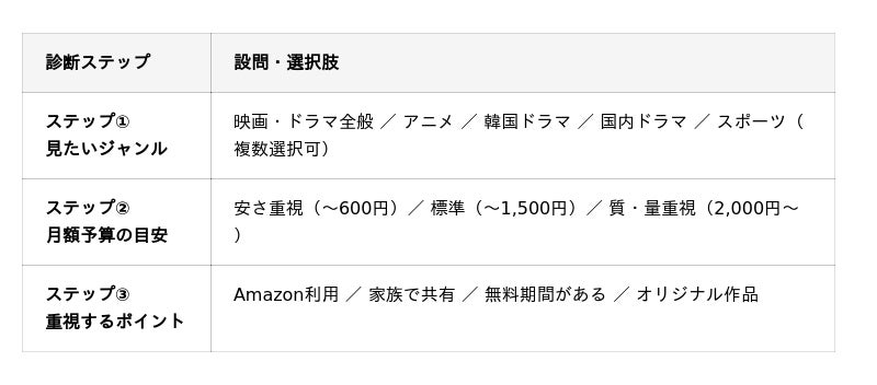 本機能は、見たいジャンル・月額予算・こだわりポイントの3問に答えるだけで、ユーザー一人ひとりに最適な動画配信サービスを即時に提案する、登録不要・完全無料のインタラクティブ診断ウィジェットです。