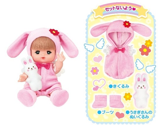 おもちゃ王国 × メルちゃん コラボコーデに新作登場(ハート)うさ耳つきフードに、袖のレースや胸のリボンがとってもキュート!さらにうさぎさんのぬいぐるみ付き!メルちゃんをピンキーに変身させてかわいいごっこ遊びを楽しもう(ハート)そして、発売中の「ハート姫ドレス」といっしょに遊ぶと楽しさアップ!3月14日(土)より全国のおもちゃ王国で発売開始