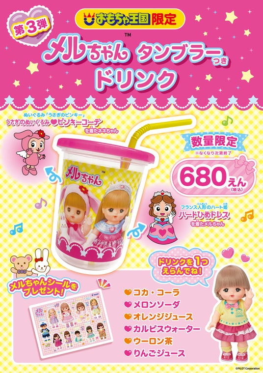 おもちゃ王国限定の第3弾メルちゃんタンブラーつきドリンクが登場!タンブラーのデザインはハート姫ドレスを着たメルちゃんとピンキーコーデを着たネネちゃんだよ!