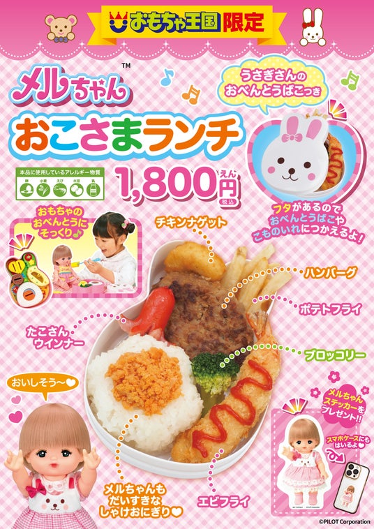 昨年大好評だった「メルちゃん おこさまランチ」が再登場!メルちゃんも大好きなしゃけおにぎりやかわいいタコさんウィンナー、ふっくらジューシーハンバーグ、さくさくエビフライなど、お子様の“食べたい!がメルちゃんのおもちゃ「おべんとうセット」と同じ“うさぎさんの形をしたお弁当箱”にいっぱい詰まっています。