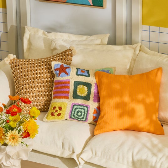 異なるモチーフを組み合わせた、手仕事の温かみを感じさせるクロシェのクッションカバーです。1枚で主役になる存在感で、お部屋に遊び心をプラスします。