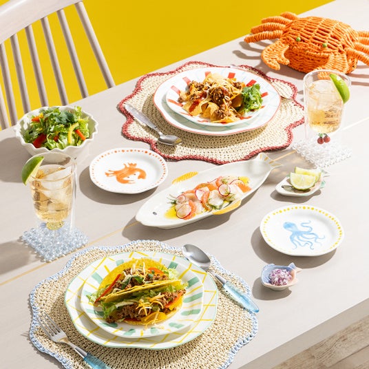 楽しげな海のエッセンスを取り入れたプレートや、カラフルに煌めくグラス、カトラリーで彩る賑やかなホームパーティーを提案。個性豊かでカラフルなテーブルウェアが、夏の料理を魅力的に演出します。