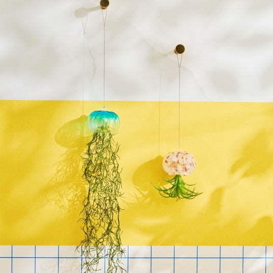 吊るして飾れるアートグリーンです。省スペースで取り入れられ、空間に立体感と軽やかさをプラスします。ジェリーフィッシュはクラゲをモチーフにしたガラス素材のデザインで、夏にぴったりな涼しげな印象に。複数を組み合わせることで、より印象的なコーディネートに仕上がります。