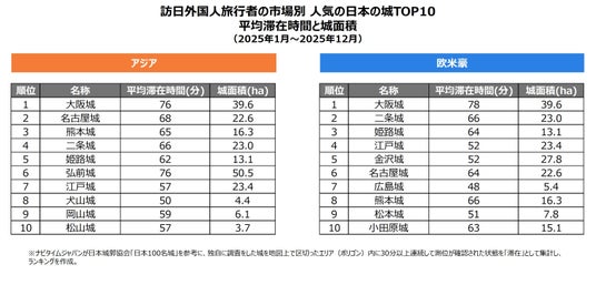 ・アジア市場と欧米豪市場における人気ランキング、滞在時間分析、各市場特有の傾向がある城の分析
