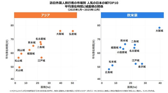 滞在時間を比較したところ、アジア・欧米豪の両市場ともに、滞在時間と城の面積に相関があることが確認できました。概ね面積が広い城ほど滞在時間が長くなる傾向にあります。両市場で1位となった大阪城は、平均滞在時間が長く観光される城の一つとなっています。