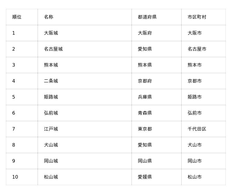 アジア市場特有の傾向として、直行便が就航している地方空港から比較的アクセスしやすい、弘前城、犬山城、岡山城、松山城がランクインしています。
