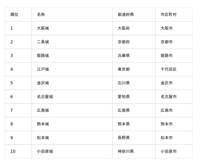 アジア、欧米豪の両市場において、最も人気の城は、大阪城となりました。名古屋城や熊本城、二条城、姫路城、江戸城も両市場のトップ10に共通してランクインしています。