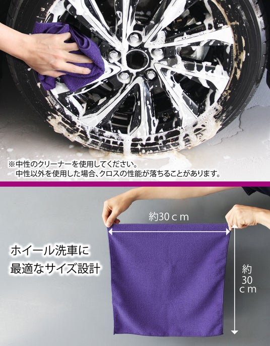 中性のシャンプーやホイールクリーナーとの併用も可能。ホイール洗車で扱いやすいサイズ(約30×30cm)