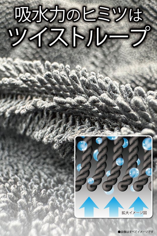 長い毛足がねじれた“ツイストループ”構造によって、一般的な綿タオルやマイクロファイバータオルよりも表面積が広く、1度に吸水できる量が多い。拭きあとが残らないため、水アカやシミの付着を防止