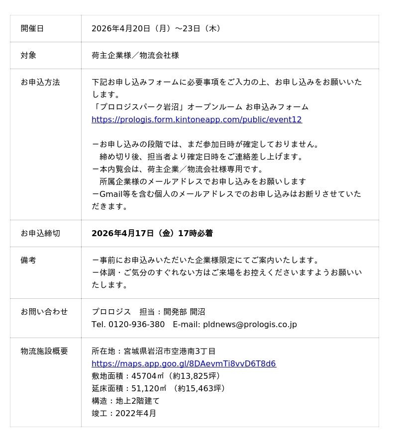 【マルチテナント型物流施設・大型物流倉庫「プロロジスパーク岩沼」内覧Week 開催概要】