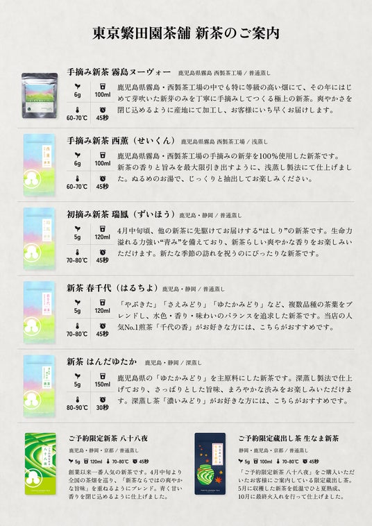 既にご予約受付を開始している「手摘み新茶 霧島ヌーヴォー」「ご予約限定新茶 八十八夜」と合わせて、今年は計6種類の新茶を発売いたします。