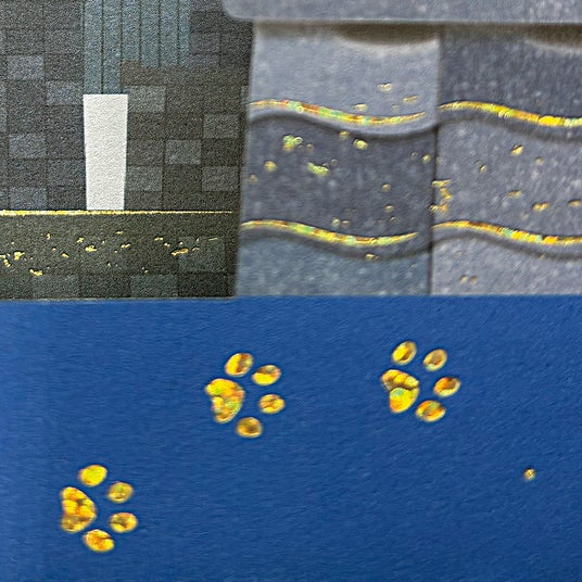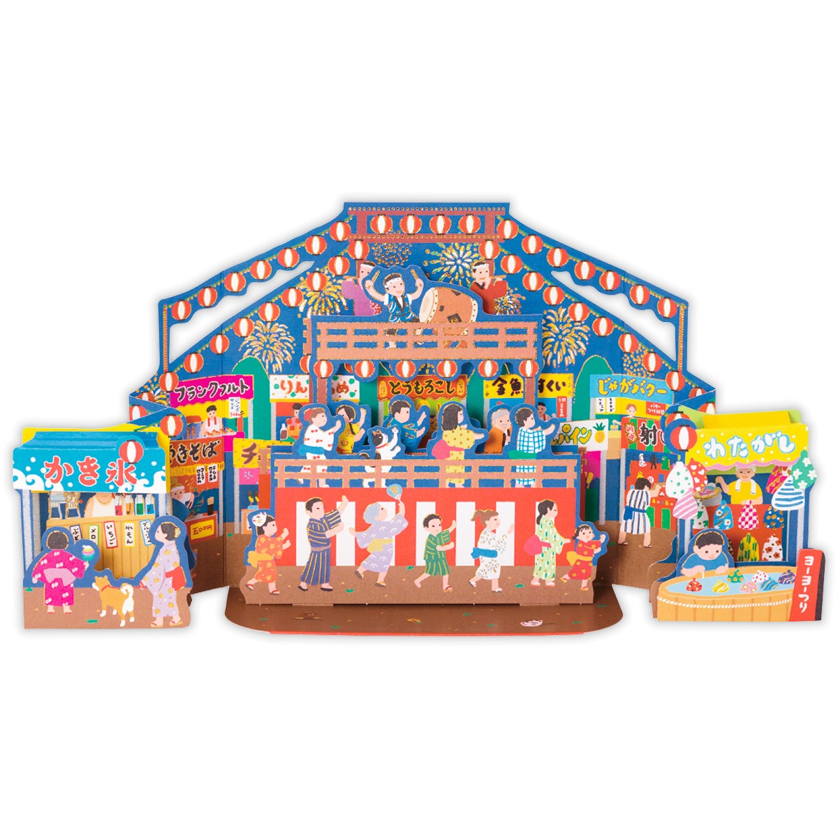 花火と屋台が織りなす夏祭りのワクワク感を立体で表現! やぐらを囲む屋台や下駄の落とし物など、細部までこだわりが詰まった、じっくり見て楽しめるカードです。