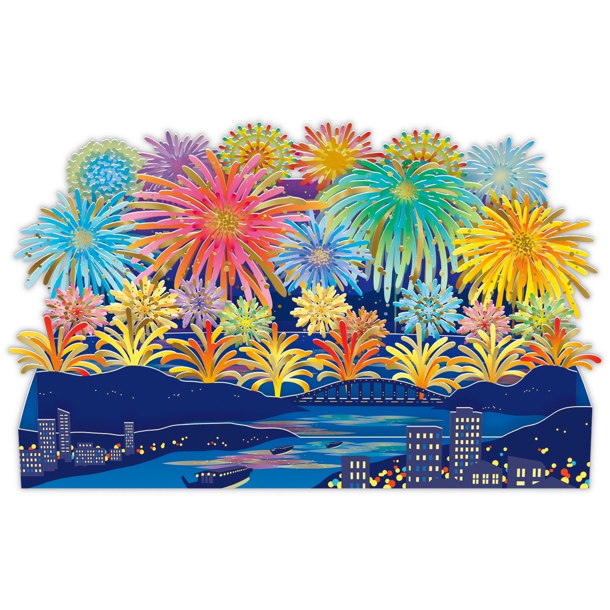大規模な花火大会の迫力が立体カードに! 夜空いっぱいに広がるカラフルな花火を、繊細なレーザー加工で細部まで美しく表現。封筒にも花火モチーフをあしらい、パッケージ全体に奥行きと華やかさをプラスしました。
