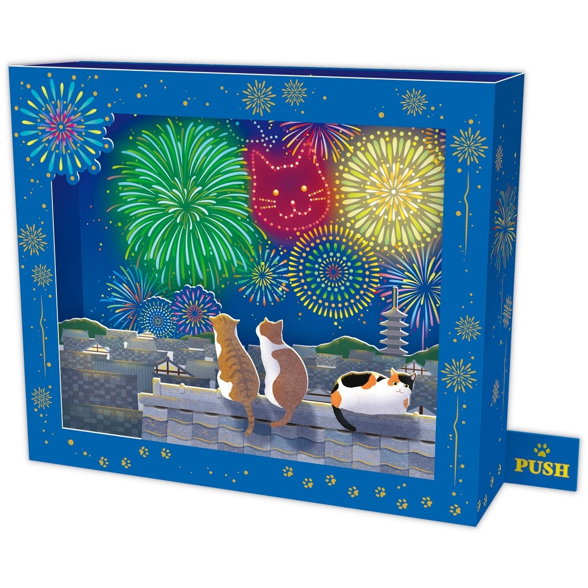 光と音による豊かな表現が魅力のLEDライト付きオルゴールカードに、通年人気の猫モチーフが登場! 夏の夜空を彩る花火と、愛らしい猫たちの後ろ姿がキュートなデザイン。猫の鳴き声と花火が打ち上がる音のほかに、夏を感じさせるどこか懐かしいオリジナルソングが楽しめる2曲入り。猫の顔型花火がポイントです。