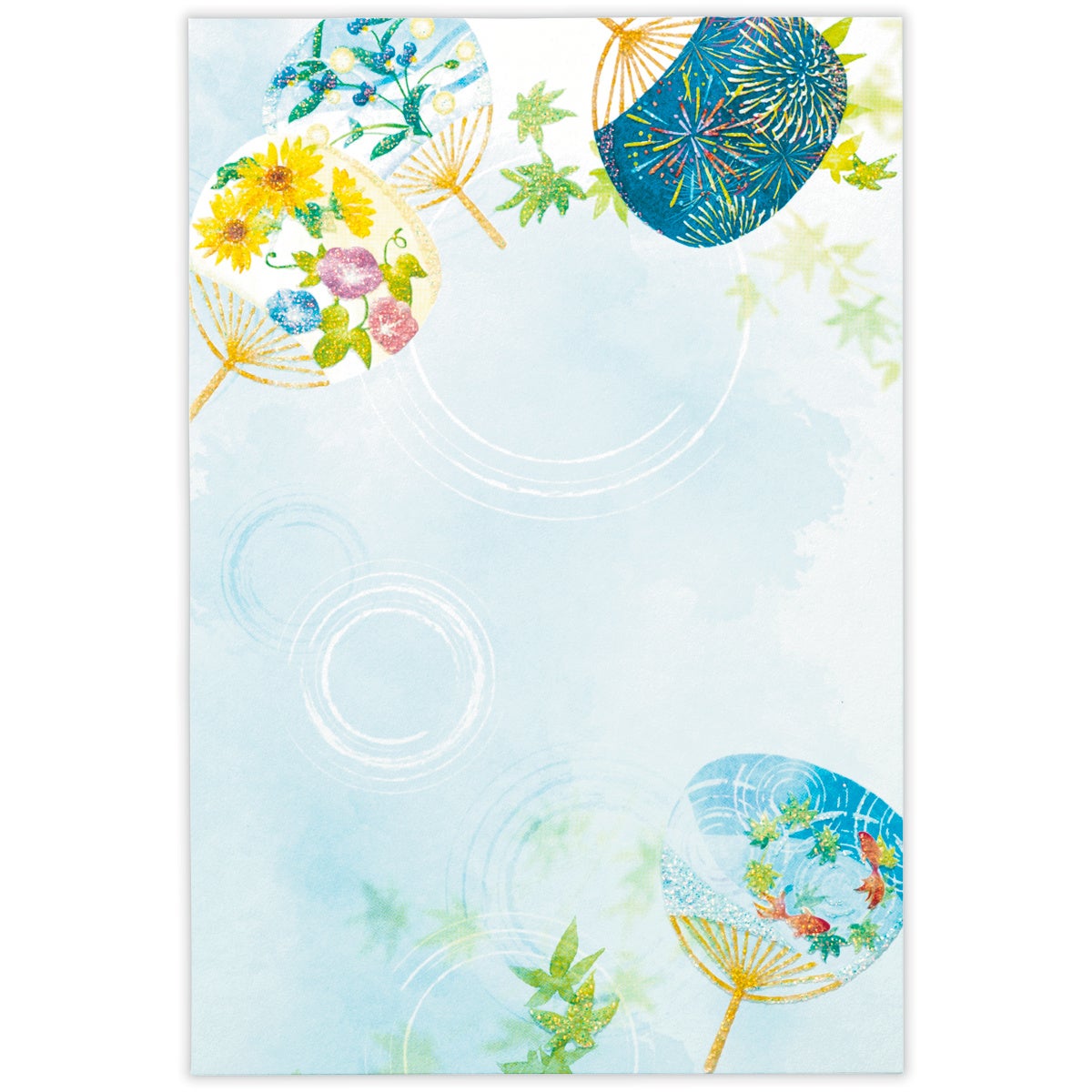 縦書きにも横書きにも書ける人気の罫線なしタイプは、風景印やスタンプの台紙として夏の思い出を残すのにもおすすめです。うちわの柄の中に夏らしいモチーフを詰め込んだ「うちわ」、透明感ある水まんじゅうやあんみつを描いた「夏菓子」の2柄。