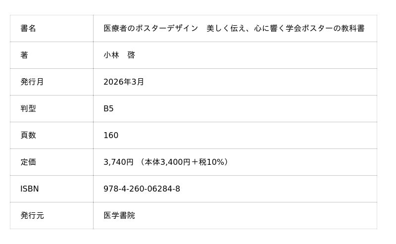株式会社医学書院 (所在地:東京都文京区、代表取締役社長:金原 俊)は、『医療者のポスターデザイン 美しく伝え、心に響く学会ポスターの教科書』(著:小林 啓)を2026年4月6日に刊行します。