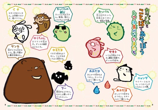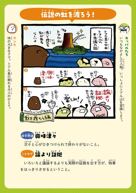 本作は、まんがとことばの解説が1ページにまとまっており、読書が苦手なお子さんでもサクッと読みやすい構成が特長です。好奇心旺盛なカッパの“カッパル”、どこでも踊っているウサギの“セキト”、いつもマイペースなネコの“ニャンダ”といった、トアル島に住むゆるくて愛らしいキャラクターたちが、日常生活のシチュエーションに合わせて言葉の使い方をナビゲート。