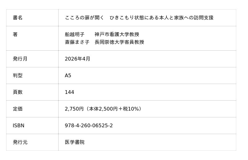 株式会社医学書院 (所在地:東京都文京区 代表取締役社長:金原 俊)は、書籍『こころの扉が開く ひきこもり状態にある本人と家族への訪問支援』(著:船越 明子 / 斎藤 まさ子)を2026年4月6日に発売します。