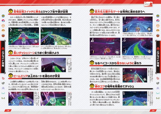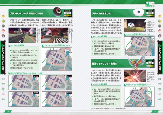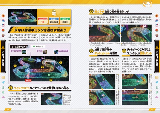 上空からの見下ろし視点でコース全体を把握しながら、ライバルとのレースを楽しめる「ウエライド」モードの全9コースを攻略。コースマップではスピードアップの決め手となるギミックを掲載し、コース上で加速や追い抜きのポイントとなるコーナーやギミックをピックアップして解説。