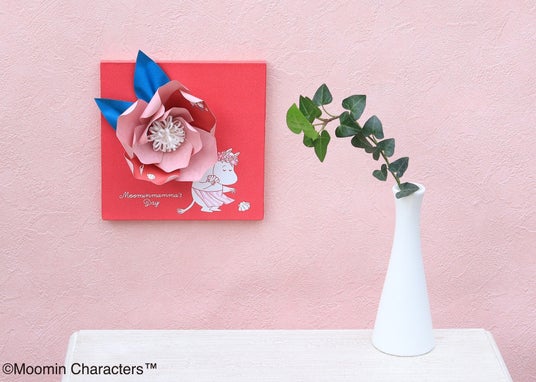大きなバラの3枚の花びらに、リトルミイやムーミンママが拾った貝殻など「Moominmamma's Day 2026」の限定モチーフを繊細に描きました。台紙には貝殻を手にして穏やかに過ごすムーミンママの姿が描かれ、見るたびに優しい気持ちを運んでくれます。