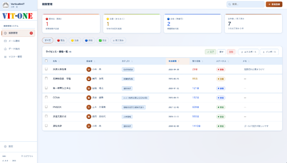 期限更新を確実に、3段階(緊急/注意/余裕)でお知らせ。