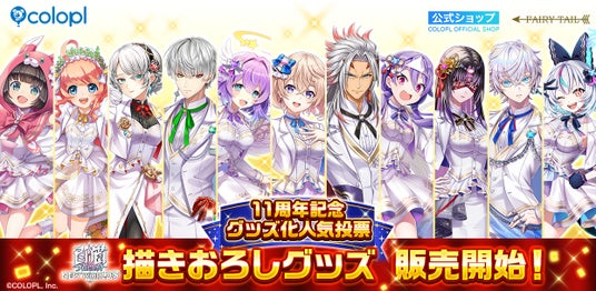 コロプラ公式ショップでは「11周年記念グッズ化人気投票フェア」を開催し、キャラファイングラフやBIGタペストリーなど描きおろしイラストを大きく確認できるグッズや、身に着けていただけるサイズのグッズなど多数販売しております。公式イラストを使用したグッズも合わせて販売しております。