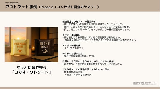 「架空商品モール」…AIが生活者のニーズとメーカーの技術力を組み合わせて独自の商品を提案する、これまでにない新しい形の新商品開発プラットフォームです。2025年12月の提供開始から2026年3月時点で、 採用企業数26社(サッポロビール、ロッテ、再春館製薬所、マルサンアイほか)、導入企業満足度は90%(支援企業へのアンケートによる当社調べ)に上ります。 特許取得済み(特許第7706630号、2025年7月3日)