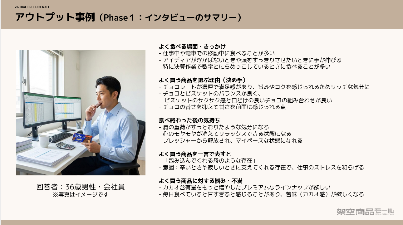 実際に、お菓子カテゴリーで弊社独自で実施したAIインタビュー(n=14名)では、以下のようなインタビューの結果と商品アイデアが生成されました。